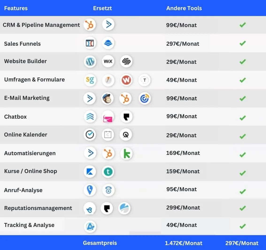 Dazu zählen beispielsweise Automatisierung von Marketingkampagnen, Kundenverwaltung, E-Mail-Marketing, Text-Marketing, Social-Media-Management, Website-Erstellung und vieles mehr.